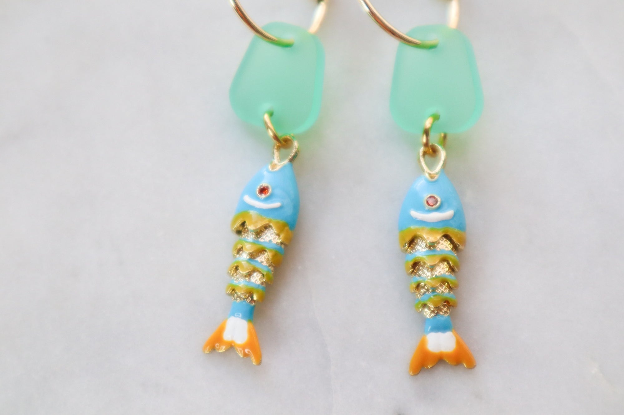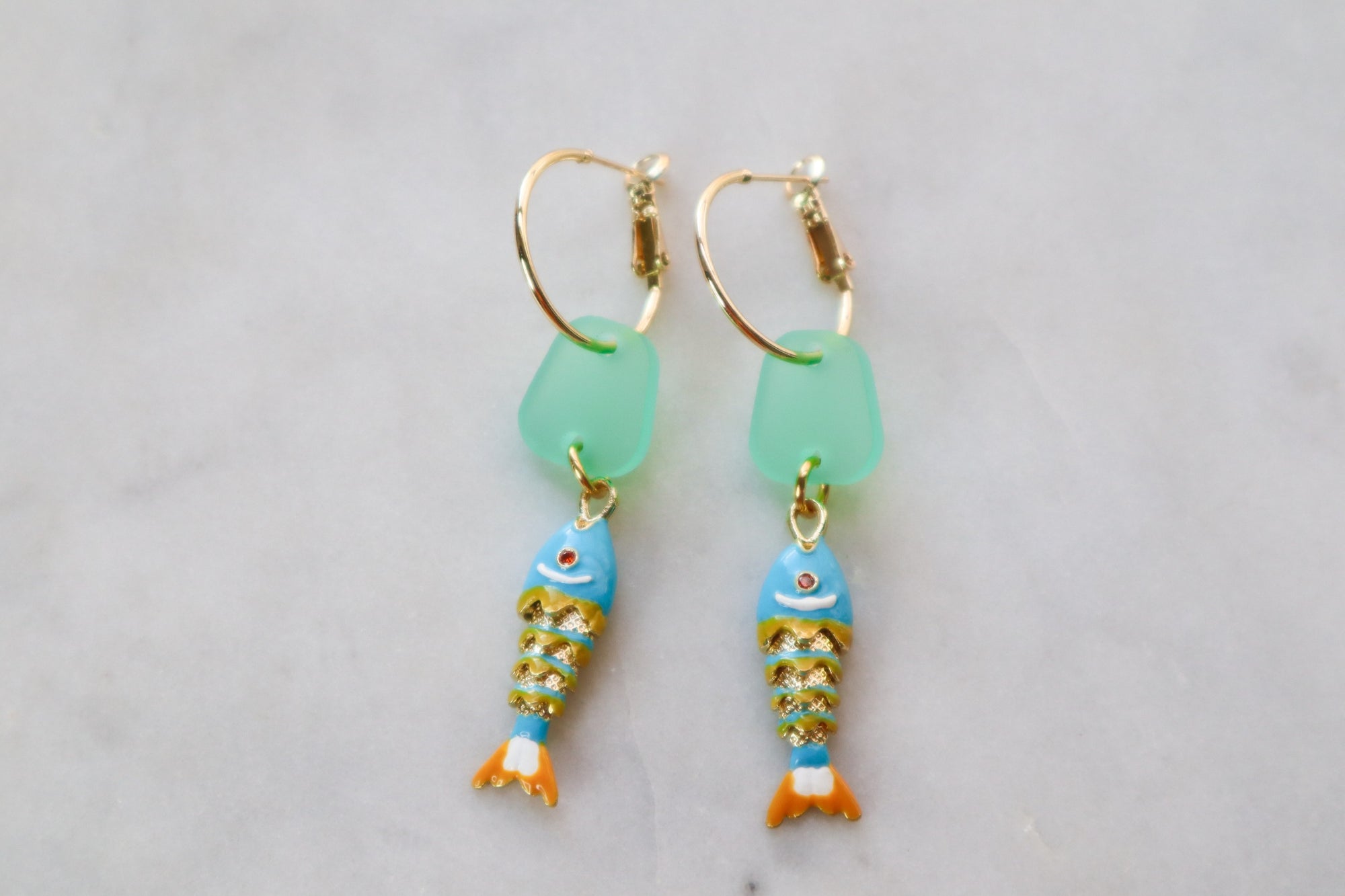 Charming enamel fish in light blue and orange dangle from polished gold-plated hoops. Crafted with gold-filled details, these distinctive earrings bring a touch of whimsy and vibrant color to any ensemble with understated sophistication.