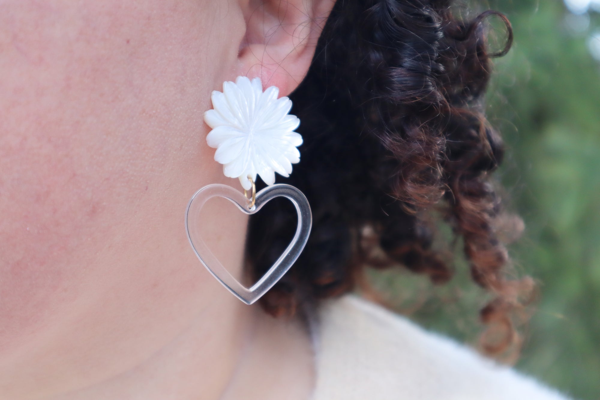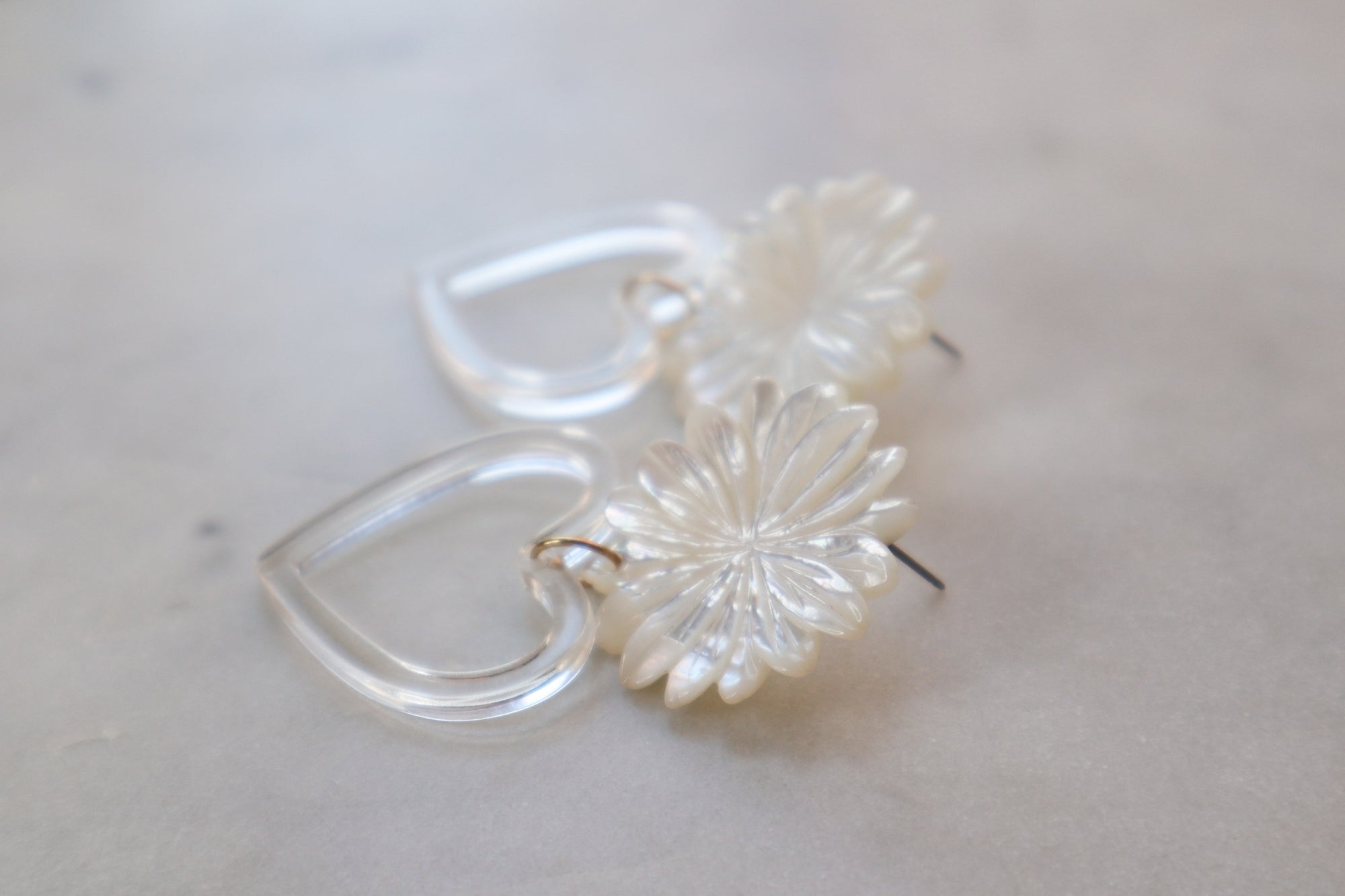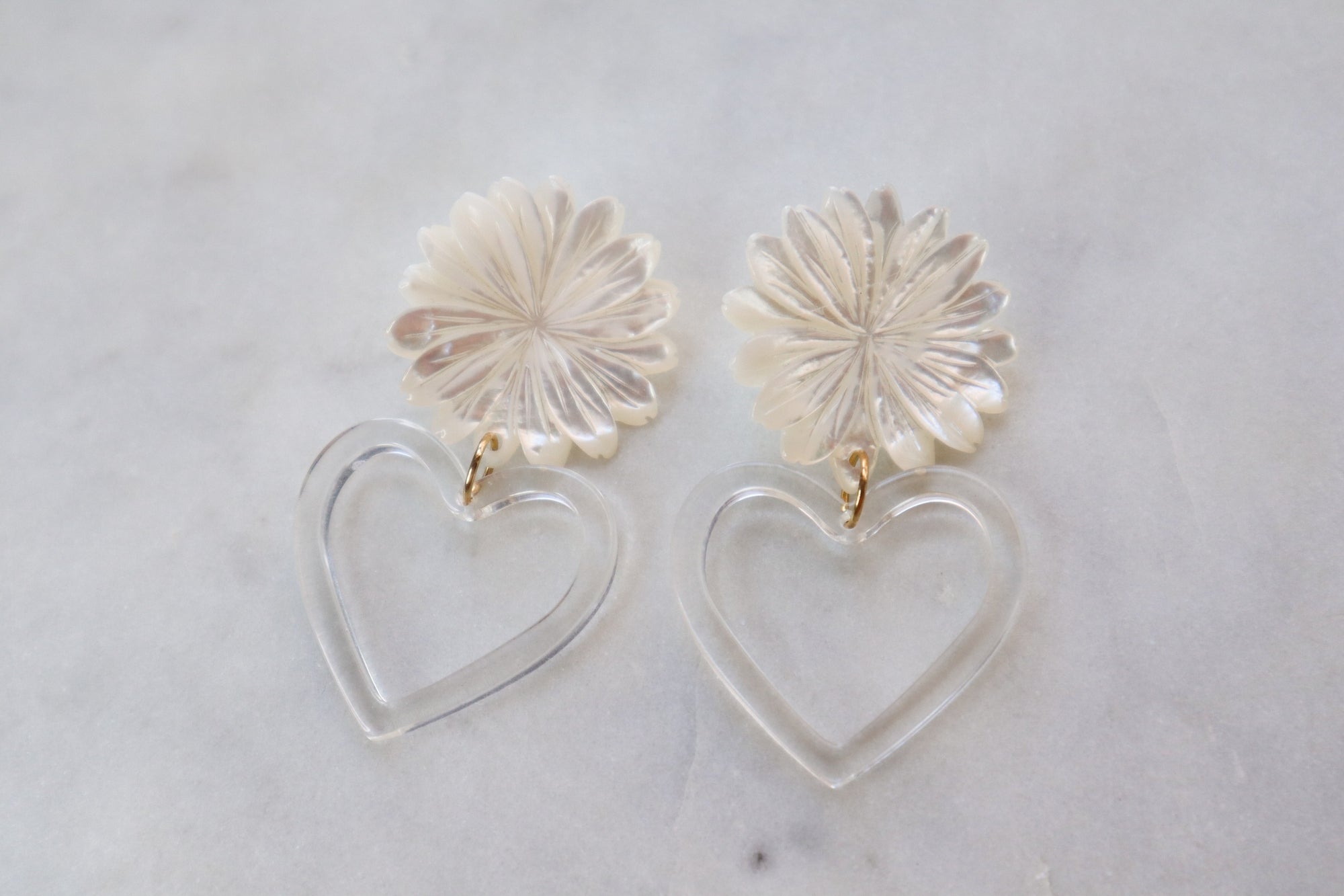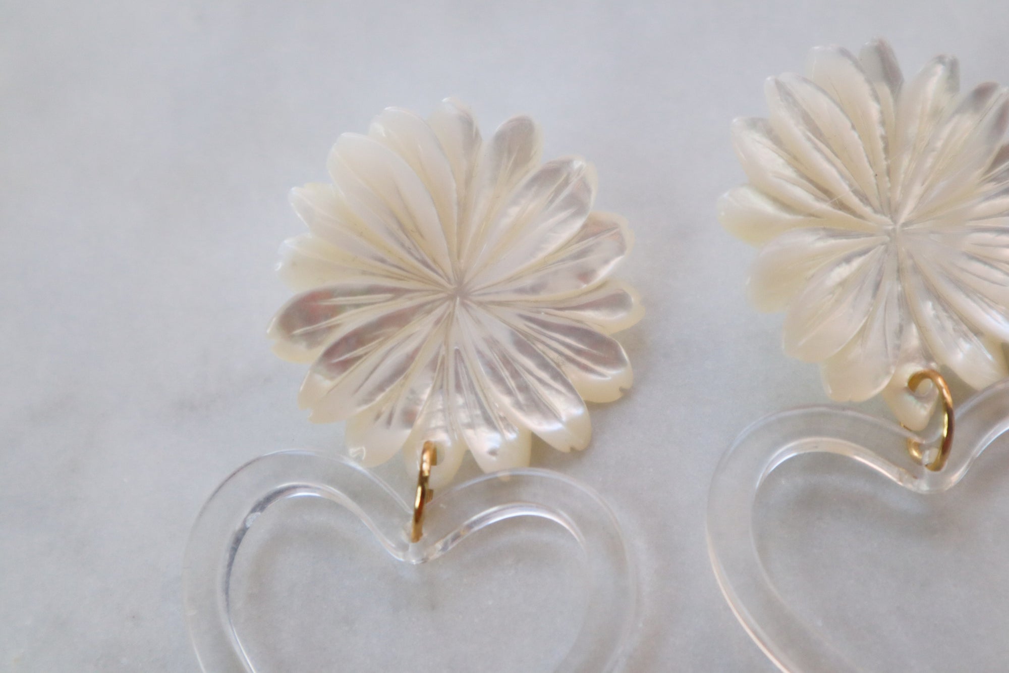 Make an elegant statement with these mother of pearl earrings featuring an oversized flower and transparent heart detail. Lightweight and hypoallergenic, they offer refined beauty without compromise. The natural iridescence of mother of pearl ensures each pair is distinctly one-of-a-kind.