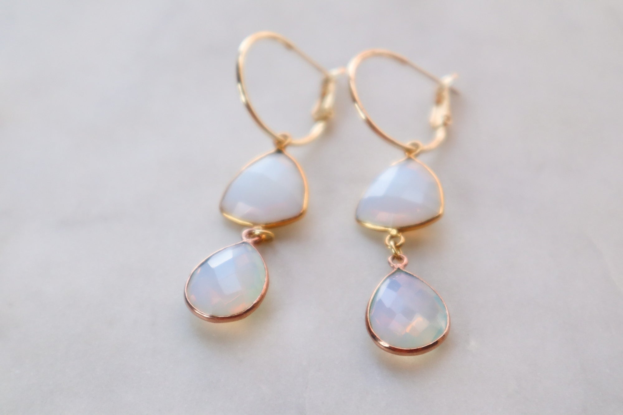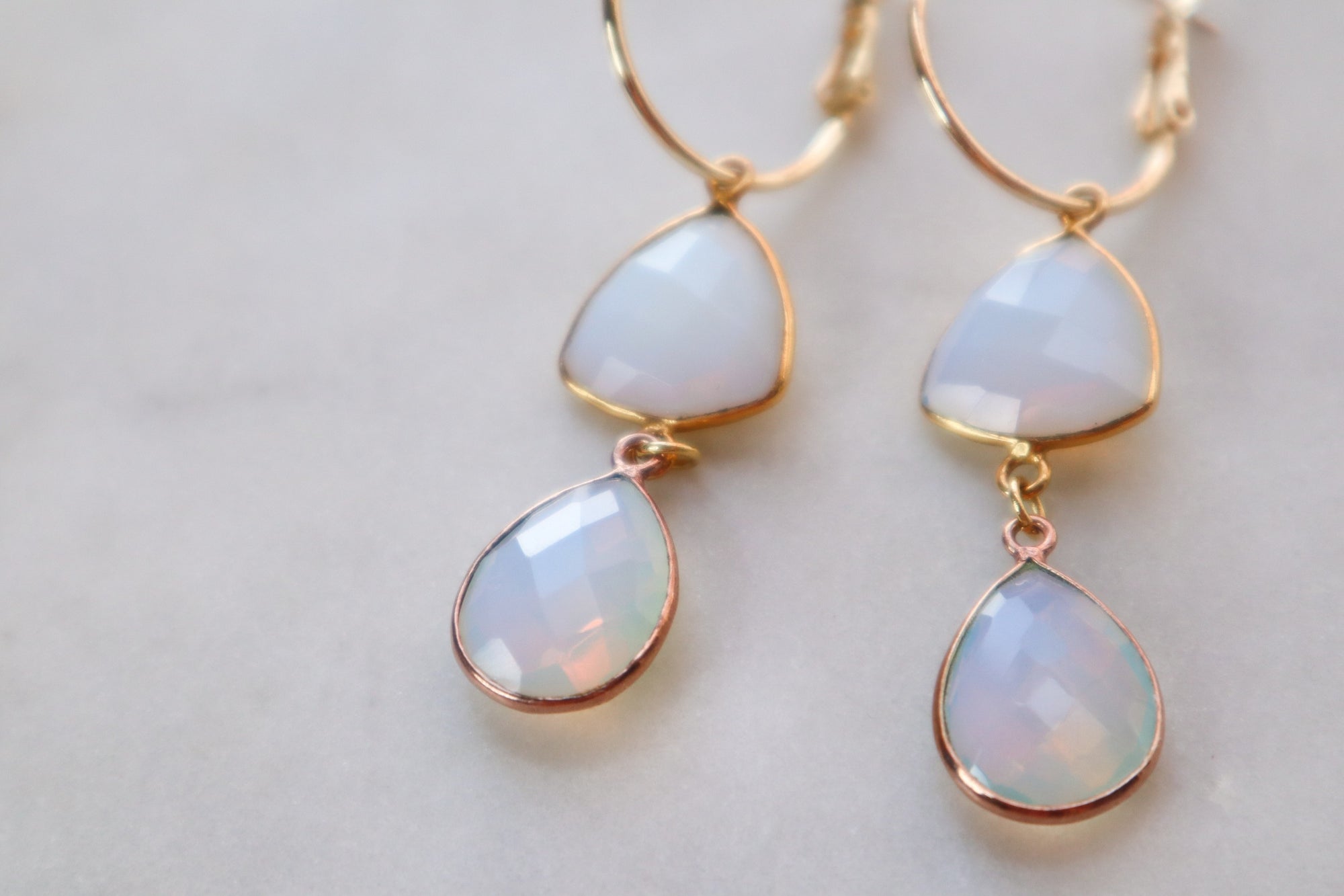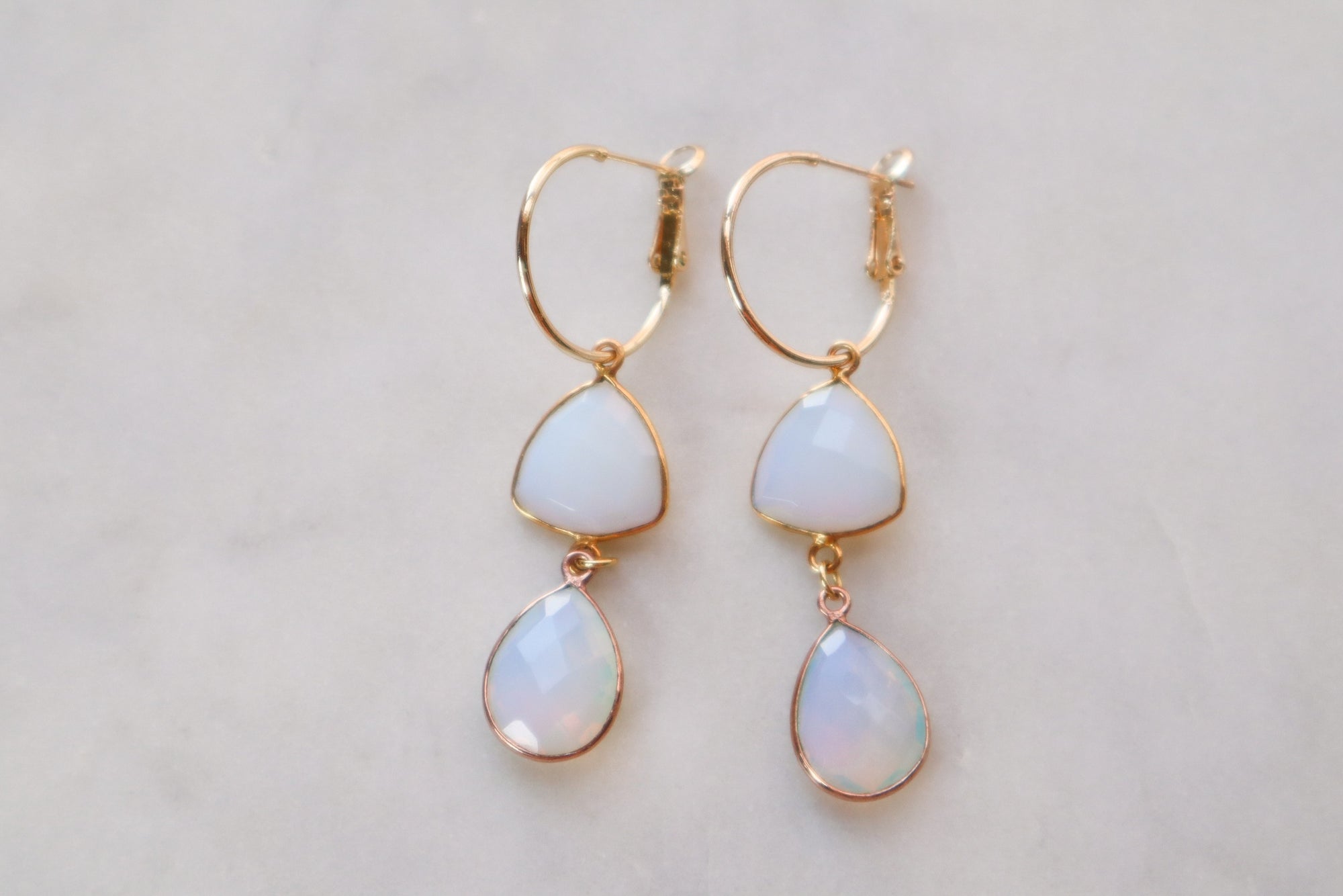 Luminous Opalite stones catch the light from 18K gold-plated hoops, creating an ethereal glow. Inspired by TS, these earrings serve as a gentle reminder that your joy is yours to create - a sophisticated accessory with meaningful intention.
