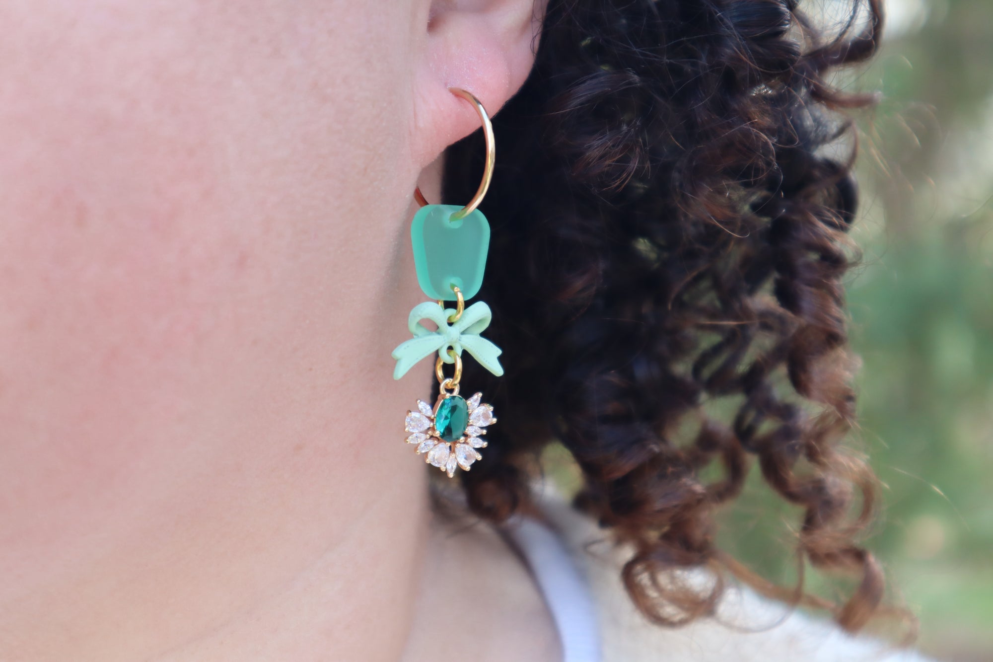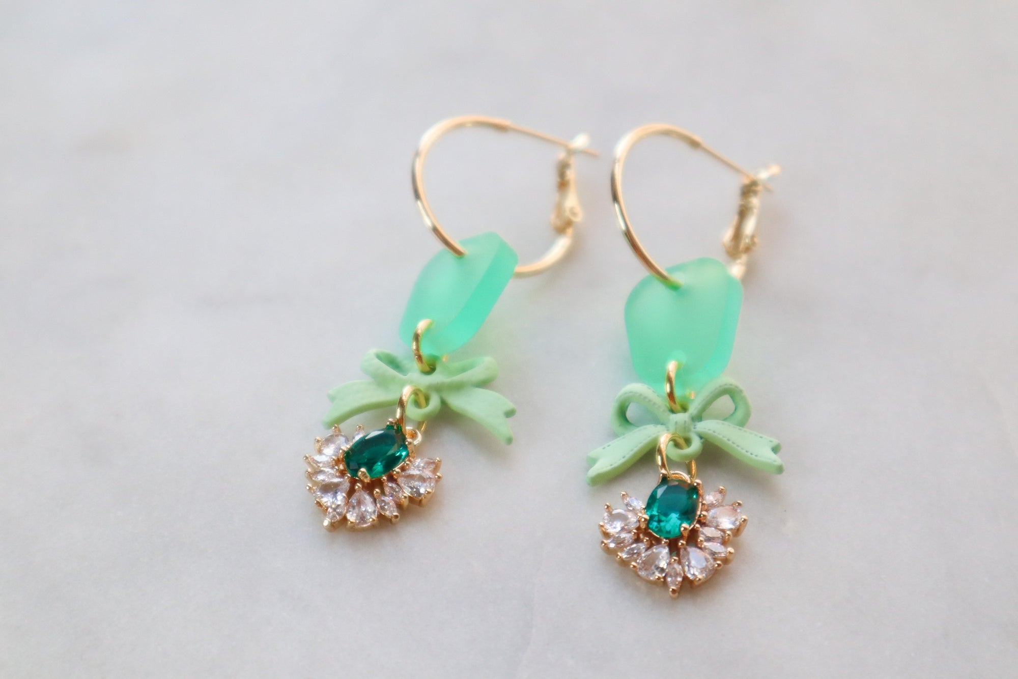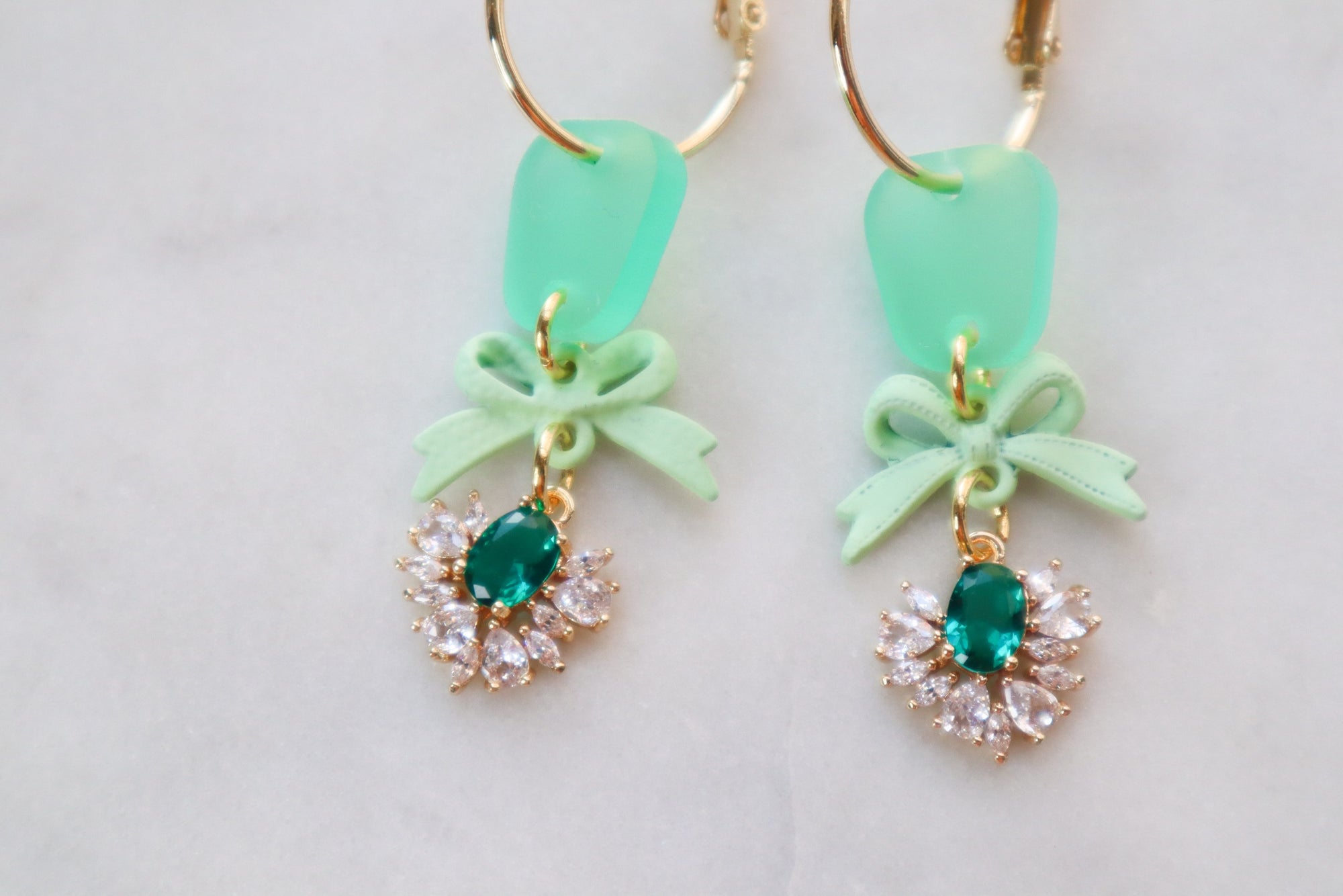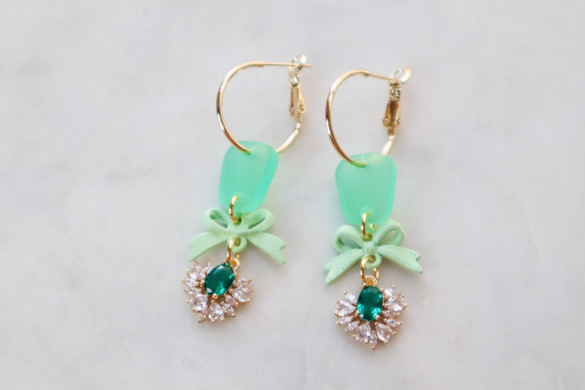 Elevate your jewelry collection with these striking hoops featuring 18K gold-plated brass construction, vibrant acrylic accents, and a whimsical mint bow. Embellished with emerald and clear cubic zirconia stones, they radiate playful confidence and colorful sophistication.
